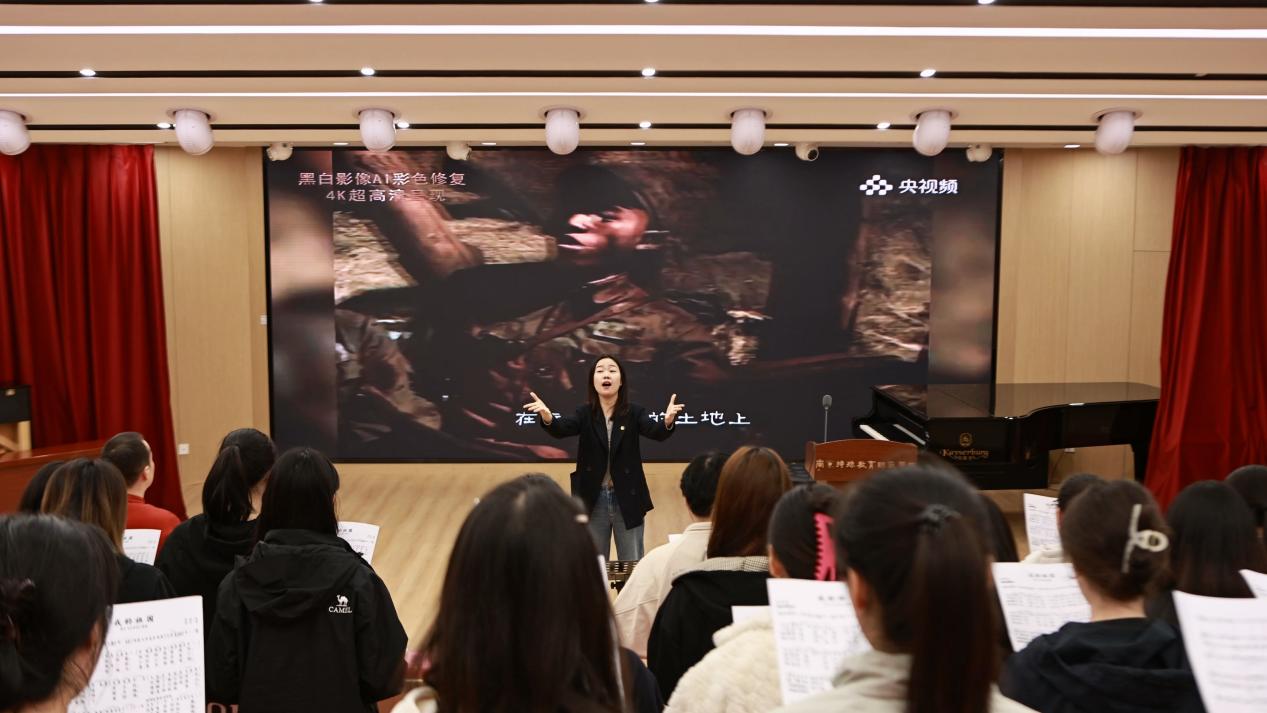 随后,教师党支部书记张敏讷博士以一曲深情磅礴的《我的祖国》作为核心载体,打造了一堂“声”入人心的“音乐党课”。张敏讷博士从歌曲诞生于电影《上甘岭》的峥嵘岁月讲起,深入剖析了其歌词中蕴含的家国意象与音乐旋律中澎湃的民族情感。她引导学员们不仅欣赏旋律之美,更要领悟作品背后“一条大河”所象征的祖国山河与民族精神。在动人的旋律中,历史画卷徐徐展开,党的奋斗历程与人民对祖国的挚爱融为一体,引发了在场学员的深深共鸣。